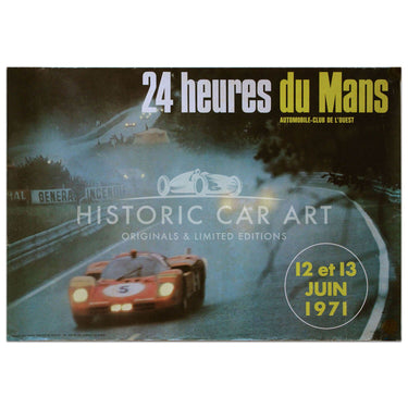 Original vintage poster for the Le Mans 24 Hours 1971 race. Photograph by Andre Delourmel shows the wet 1970 race and the Jacky Ickx Ferrari 512S. It was after the 1970 race that drivers became actors for the Steve McQueen film Le Mans.