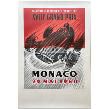 An Official Re-edition poster for the 1960 Monaco Grand Prix. Artwork is by R. Lorenzi. The race was won by Stirling Moss for Lotus-Climax, from pole position.