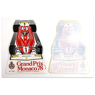 A pair of original vintage stickers (one is a window sticker) for the 1978 Monaco Grand Prix, which was won by Patrick Depailler for Tyrrell-Ford.