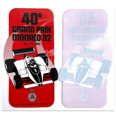 A pair of original vintage stickers (one is a window sticker) for the 1982 Monaco Grand Prix, which was won by Riccardo Patrese for Brabham-Ford.