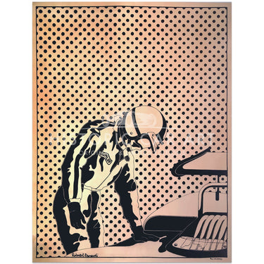 An original Dunlop advertising poster from 1968 featuring driver and Can-Am car. Stylised artwork by Italian artist Roberto Droandi.