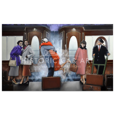 An elegant illustrative oils on linen artwork. A gentleman greets his wife who has just arrived at Waterloo Station on the evening Cunarder train from Southampton, set in the mid 1950s.