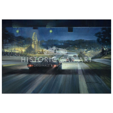 Limited edition print. The winning Porsche 956, driven by Schuppan, Holbert and Heywood, speeding past the fairground lights during the night.