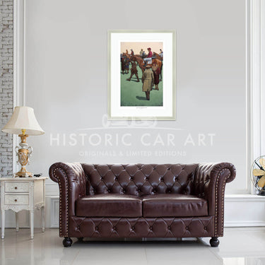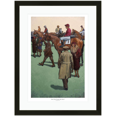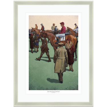 Limited Edition Print. A paddock scene in the 1920s. A lady is anxious to know if her friend placed her bet after was given a tip. The owners colours are left to right; Sir Wyndam Portal. Mr R.F. Watson. The Duke of Devonshire. Mrs H.E. Morriss. The Earl of Durham.