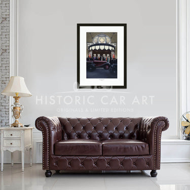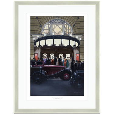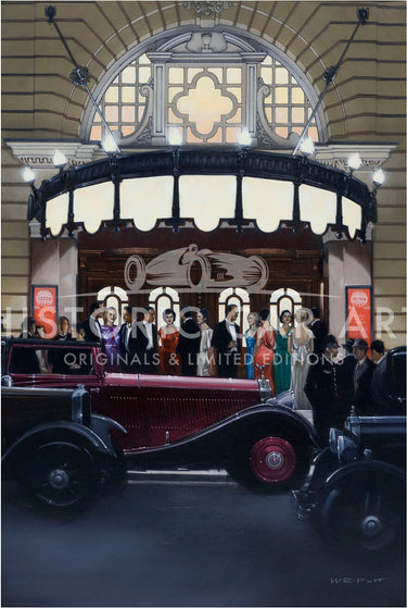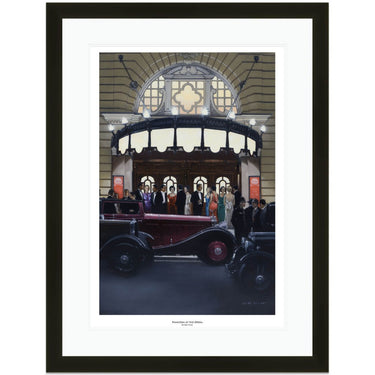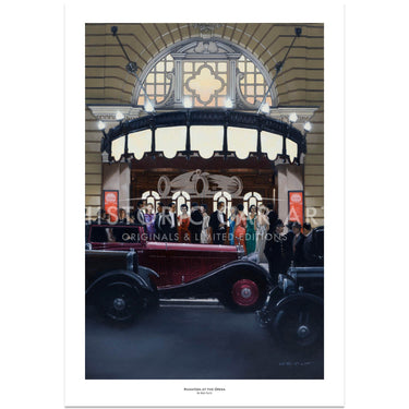 Art print of a very elegant painting entitled Phantom at the Opera. A 1933 Rolls-Royce Phantom II Continental parked in front of the Coliseum Theatre in St. Martins Lane, London, at night in the 1930's.