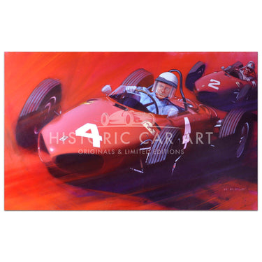 Original Painting. 1961 Belgian Grand Prix. The Ferrari 156 of Phil Hill leads Wolfgang von Trips for a Ferrari 1-2-3-4.