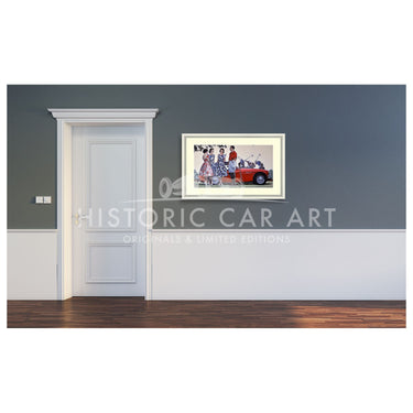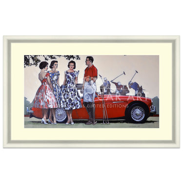A beautiful lifestyle painting entitled The New Boyfriend. In this artwork an Austin-Healey 100/6 is parked besides a polo field. The girl has a new polo playing boyfriend that she is gleefully introducing to her friends...