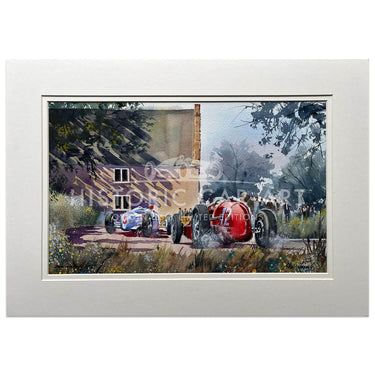 An original watercolour painting depicting Manfred von Brauchitsch being chased by team mate Rudolf Caracciola, taking the hairpin at the 1937 Donington Grand Prix.