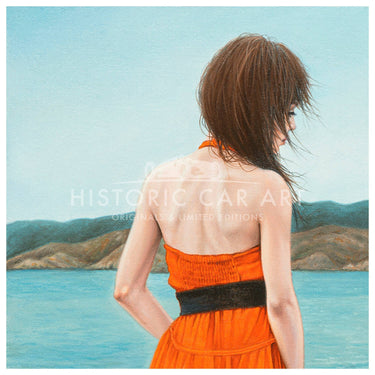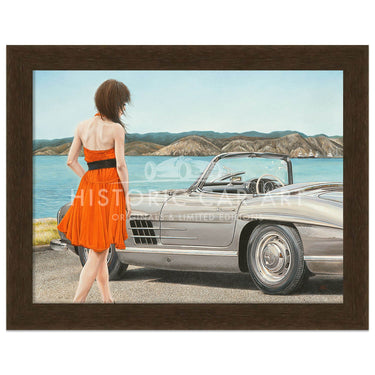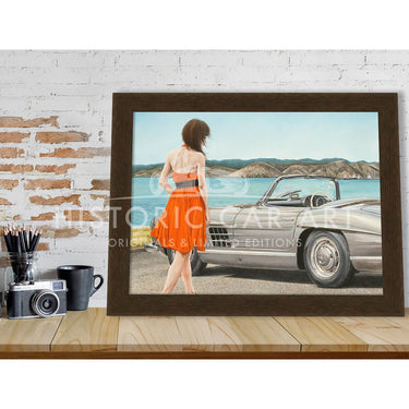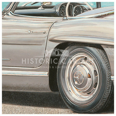 The Mercedes-Benz 300SL Roadster is depicted in fabulous detail in this scene by photorealist artist S.Smyth. His delicate oils on canvas paintings are the result of many hours of painstaking, precise work with a variety of tiny brushes.