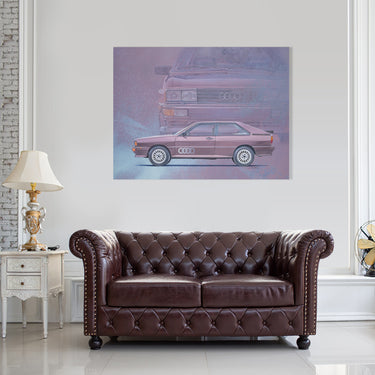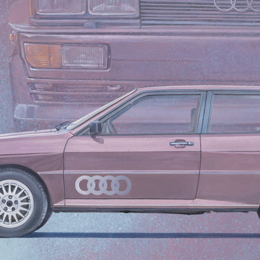 An original contemporary painting of the 1981 Audi Quattro in Saturn bronze metallic by Simon Britnell.