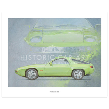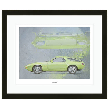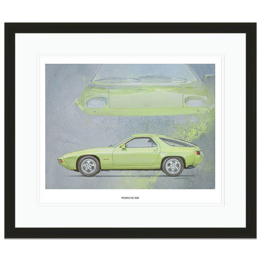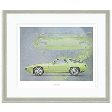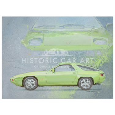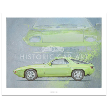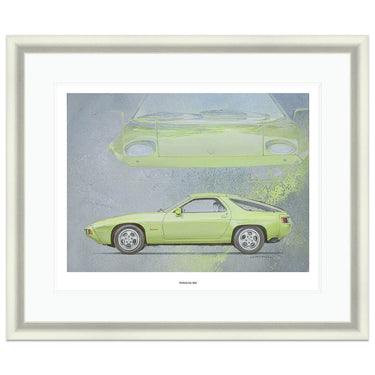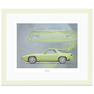 A limited edition print of the Porsche 928. A stylish, contemporary artwork by Simon Britnell of the Porsche 928, shown here in lind grün (Light green metallic).