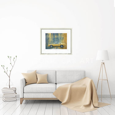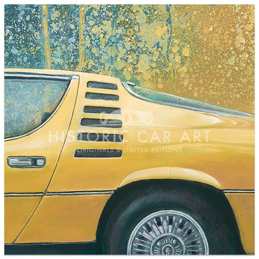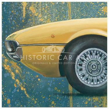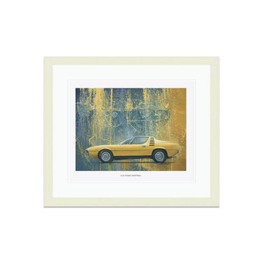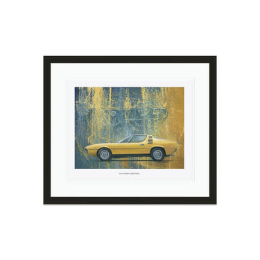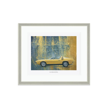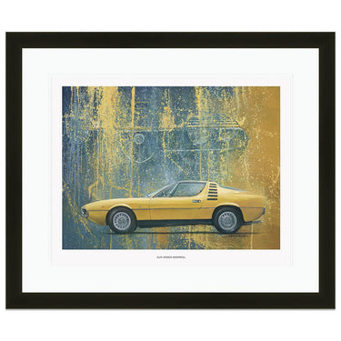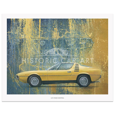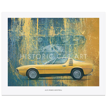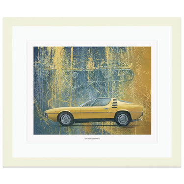 Alfa Romeo Montreal fine art print. A wonderful artwork by Simon Britnell of the Bertone designed Montreal. This 2+2 coupe was launched in 1970, particularly stylish was the cars front end with the partially covered 4 headlights and bonnet NACA duct.