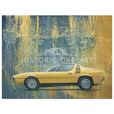 Alfa Romeo Montreal original art. A stylish artwork by Simon Britnell of the Bertone designed Montreal. This 2+2 coupe was launched in 1970, particularly stylish was the cars front end with the partially covered 4 headlights and bonnet NACA duct.