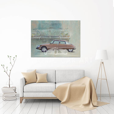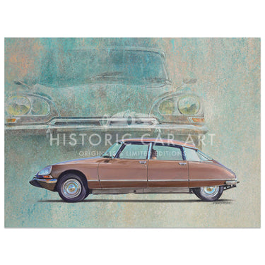 Citroen DS23 Pallas original art. A stylish, contemporary artwork by Simon Britnell of the space-age looking Citroen DS.