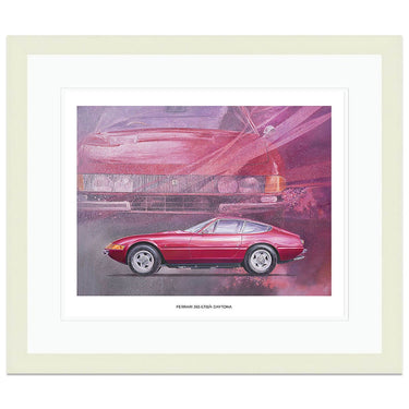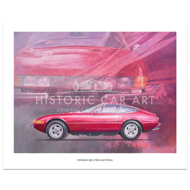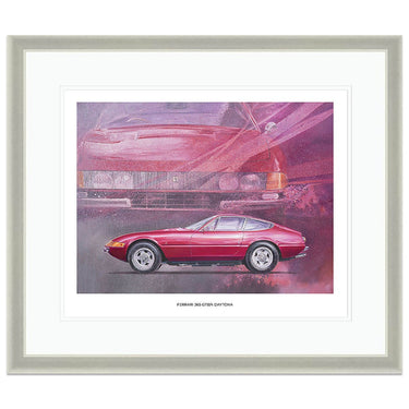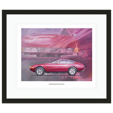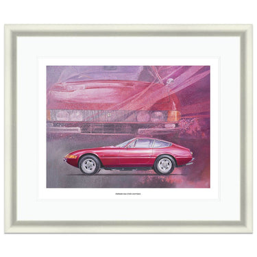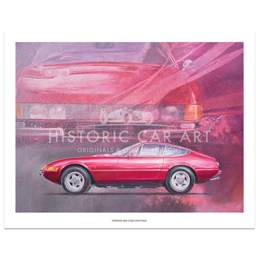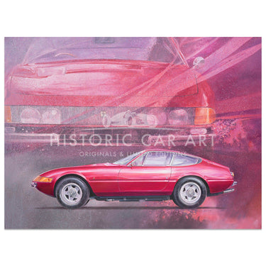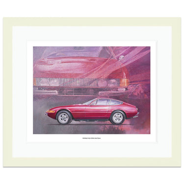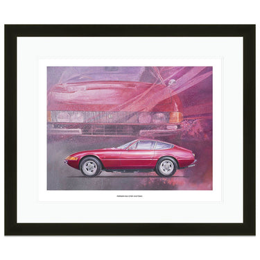 Ferrari Daytona 365 GTB / 4 limited edition print. A stylish, contemporary artwork by Simon Britnell of the Pininfarina designed Ferrari Daytona. Shown here in Rosso Bordeaux. Built from 1968 - 1973 the early cars had headlights behind a perspex cover. These were later replaced by pop-up headlights due to demands of US safety laws.