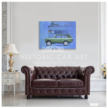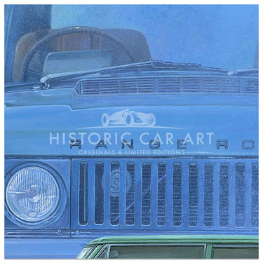 An original contemporary painting of the 1971 Range Rover "Suffix A" in Lincoln Green by Simon Britnell.