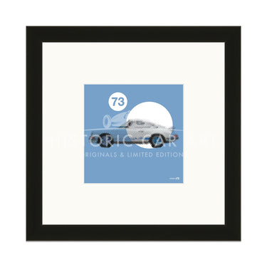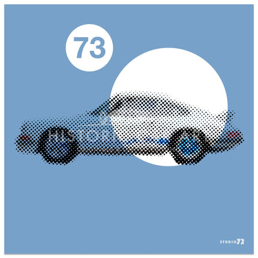 White / Blue 1973 Porsche 911 2.7 RS against Gulf Blue art print. By Studio 72 Design.