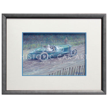 An original painting. The 1924 French Grand Prix was designated the European Grand Prix for that year. The race was held on a public road course around Lyon, France on 3 August 1924. Henry Segrave took pole position for Sunbeam and lead from the Sunbeam of K.L. Guinness, until Guinness shown in this painting retired with broken brakes after 280 miles. The race was won by Campari for Alfa Romeo.