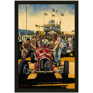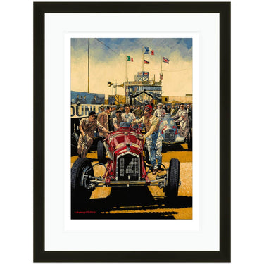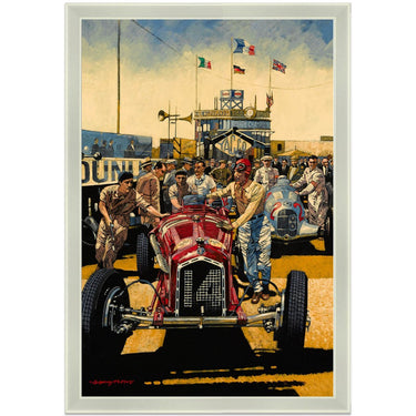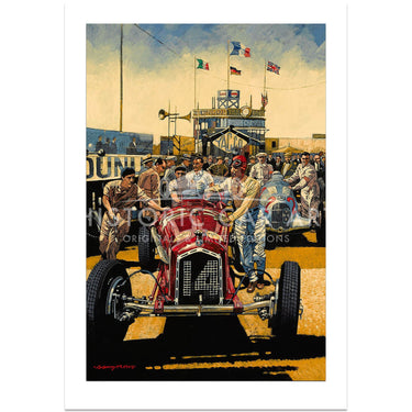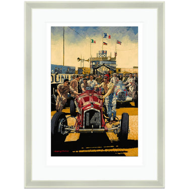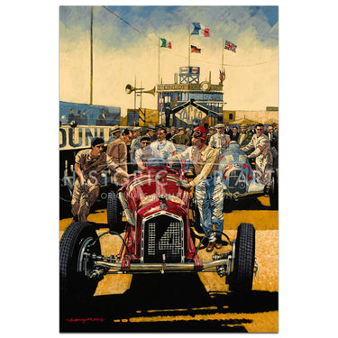 Limited Edition Print. Tazio Nuvolari walks with his Alfa Romeo Tipo B P3 from the pits to start the 1935 French Grand Prix at Montlhéry. He lead the Mercedes and Auto Unions for the first 14 laps before retiring with transmission failure. He set fastest lap.
