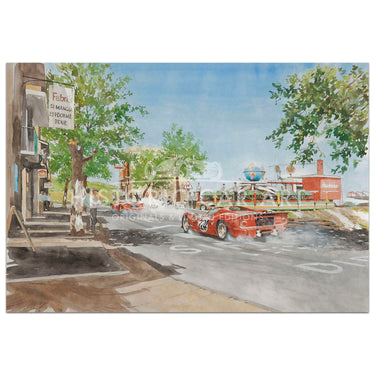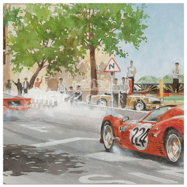 The Nino Vaccarella / Ludovico Scarfiotti Ferrari 330P4 speeds through the quiet village streets of Sicily during the 1967 Targa florio in this lovely limited edition print.