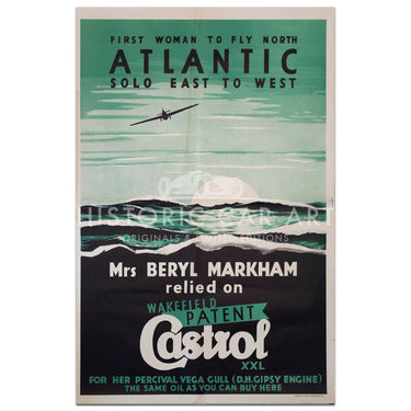 Original vintage poster produced by Castrol in 1936 to celebrate Beryl Markham's first solo flight across the Atlantic by a woman.