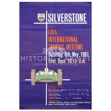 A very striking original poster. Great graphic design for an early 1960's poster which would look at home in any vintage or contemporary environment. Published by the British Racing Drivers Club. The race was won by Stirling Moss.