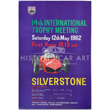 Original vintage poster for the International Trophy Race 1962 held at Silverstone. This colourful, graphic poster features a lovely image of the Ferrari 156 Sharknose. The race was won by Graham Hill.