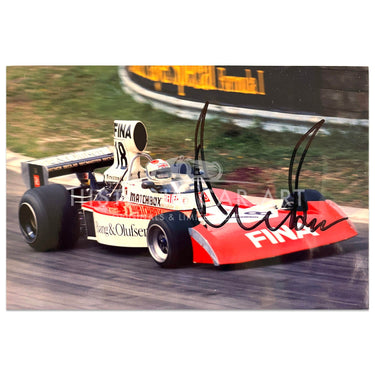 A photograph, taken in 1974 of Derek Bell during the 1974 F1 season - it is also signed by Bell.