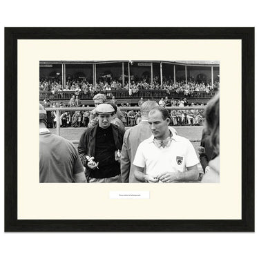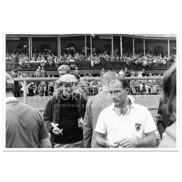 In this photograph Stirling Moss is deep in thought on the start grid of the 1957 British Grand Prix in front of a packed grandstand at Aintree. Fangio is in the foreground left.