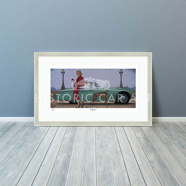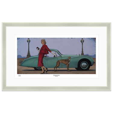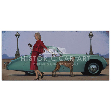 Limited Edition Print. Dressed in the latest Paris fashion a young lady parks her Jaguar XK 120 on Chelsea Embankment and walks into town with her greyhound in the spring of 1953.