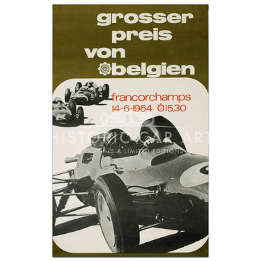 Original vintage poster for the Belgian Grand Prix 1964 held at Spa Francorchamps. The poster features the Lotus 25 of Jim Clark.